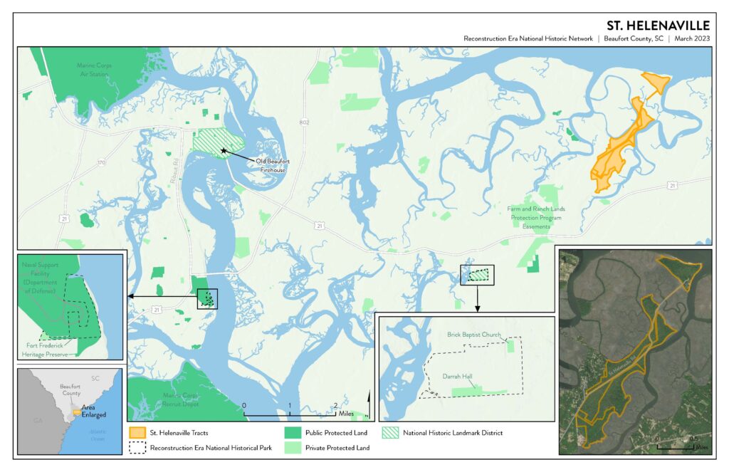The 500-acre Pine Island and St. Helenaville property has two listings on the National Register of Historic Places for its archeology and architecture. It is one of the last large, mostly undeveloped tracts on St. Helena Island and surrounded by the Morgan River, Village Creek, and Eddings Creek in the St. Helena Sound. This land has served as a family retreat and hunting and timberland for half a century, but the proposed golf resort now threatens this pristine landscape.